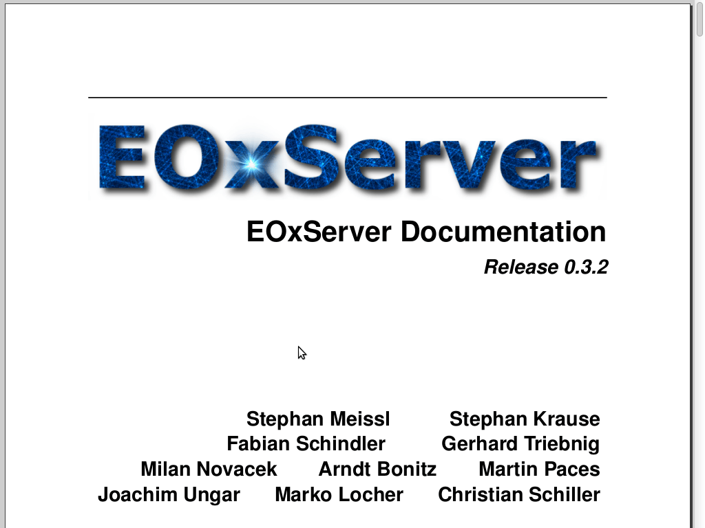 Посмотрите также Обзор EOxServer, the локальную документацию EOxServer или онлайн документацию для более подробной информации.
