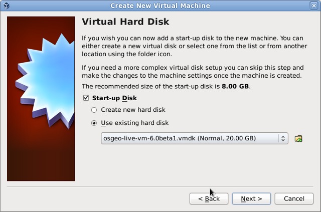 Для продолжения нажмите “Вперёд”. Выберите “Использовать существующий жёсткий диск”. Нажмите на кнопку обзора (иконка в виде папки) и укажите путь, куда вы сохранили osgeo-live-vm-6.0.vmdk. Выберите этот файл, нажмите “Открыть”, затем “Создать”.