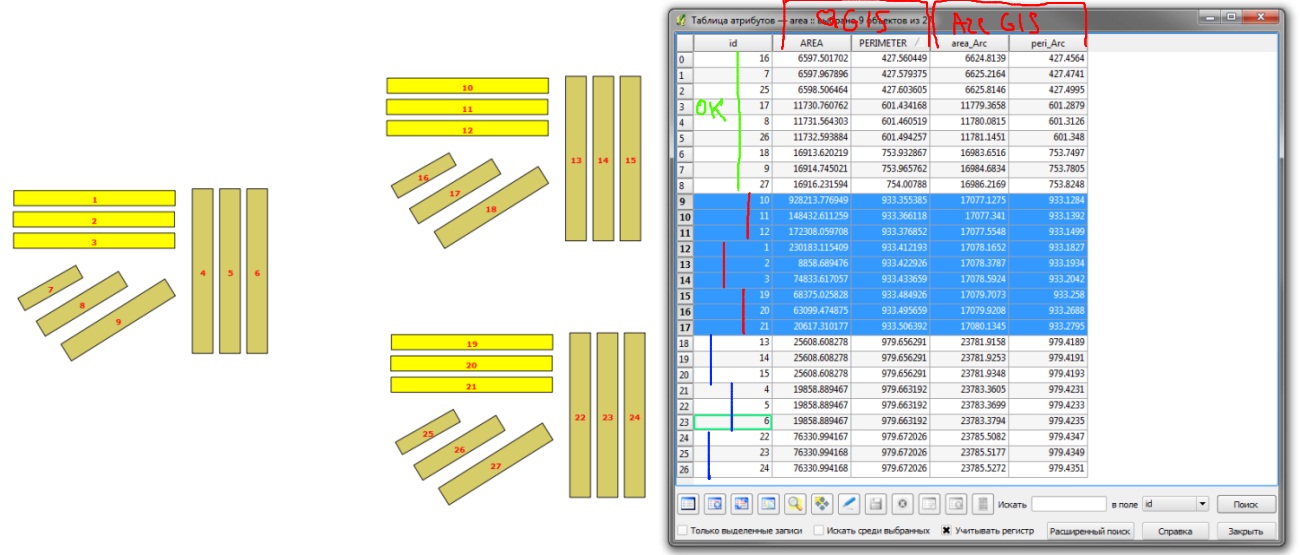 смотрим картинку - объекты (10-12, 1-3, 19-21 - большая из сторон для объектов нарисована вдоль горизонтальной оси) имеют одинаковые размеры сторон, но площадь для них разная и не соотвествует реальной. В посте я описал, что при расчете на "эллипсоиде" для "горизонтальных и вертикальных" объектов площадь вычисляется неверно.gimran писал(а):То, что при отрисовке имеет прямоугольную площадь, в констексте системы координат может иметь не прямоугольную форму и, как следствие, при вычислении площади имеет важность СК, округление числа π, долгота.