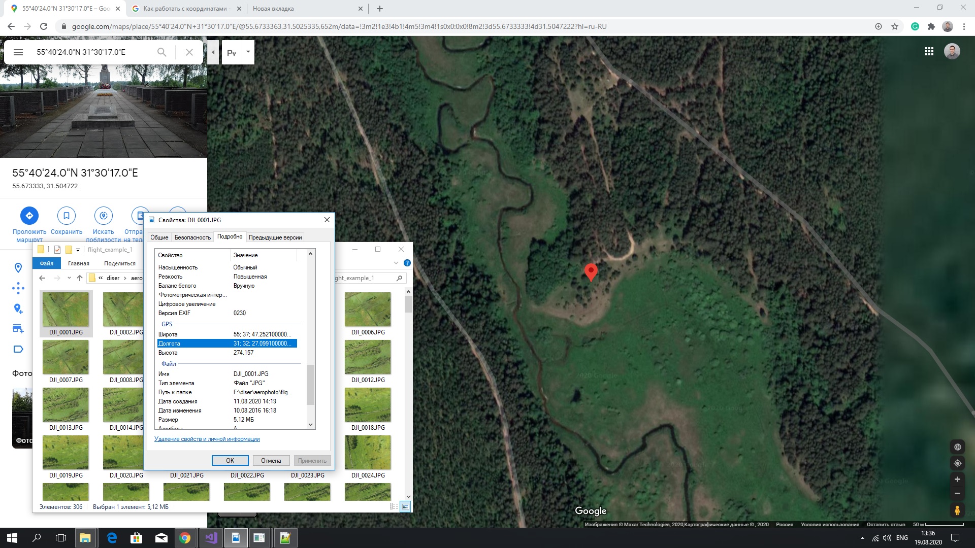 yuraiu02 писал(а): 19 авг 2020, 14:10Сканируемая территория имеет координаты 55'40'24N 31'20'14E, привязка tif правильная и в гугл картах по этим координатам именно это место. Но в данных EXIF jpg координаты неправильные - 55'37'47 31'32'27