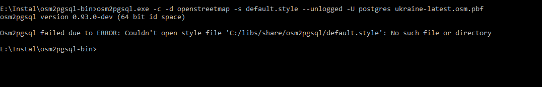 d:\Downloads\SQL\osm2pgsql\0.92.RC1_x64\osm2pgsql.exe -c -d <имя-базы-данных> -S <имя-файла-стиля-можно-default.style> --unlogged -U <имя-пользователя-базы-данных> <файл-с-данными-осм>-