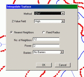 Здесь нужно обратить особое внимание на поле Z value - проверьте, что это действительно поле, соответствующее высоте (если вы, конечно, не удалили все прочие поля). Методы интерполяции вам вполне подойдут те, что стоят по умолчанию (обычно используется метод IDW). Что же касается поля Barriers, то в принципе оно предназначено, чтобы при построении GRID учитывалась и линейная тема горизонталей как границ между классами значений высот, но использование этой возможности сильно добавляет вычислений процессору.