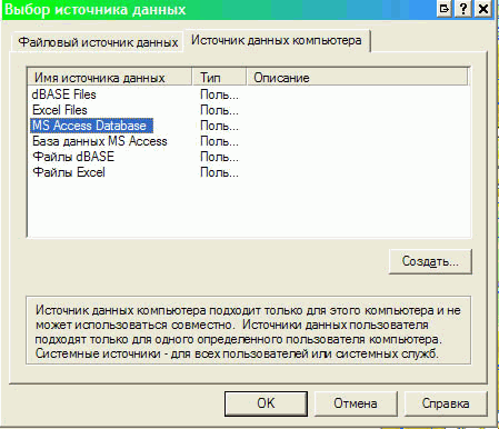 Примечание: использован компьютер с English Windows Server 2003 с установленным пакетом MUI RUS и русским MS Office 2007. На машинах с другими языками ОС и Office возможно, данные диалоговые окна будут выглядеть несколько по другому, главное – в «Выборе источника данных» выбрать БД MS ACCESS.