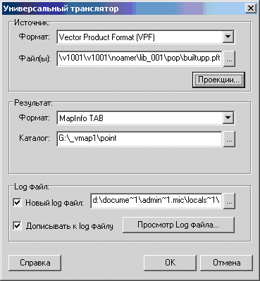 Данные VMAP1 находятся в системе координат Geographic (Lat/Lon), поэтому необходимо обязательно указать проекцию Долгота/Широта (WGS: 84) (EPSG:4326) иначе, по умолчанию “Универсальный транслятор” выполнит преобразование в non-earth (т.е. без географических координат).