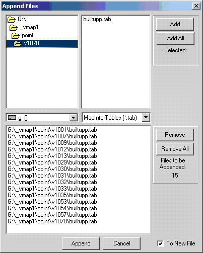 После чего появится новый элемент меню MapInfo Append. В левом верхнем окне диалога выбираем директорию, содержащую таблицы, которые появятся в правом верхнем окне. Кнопками Add и Add All выбираем таблицы, которые будем объединять.